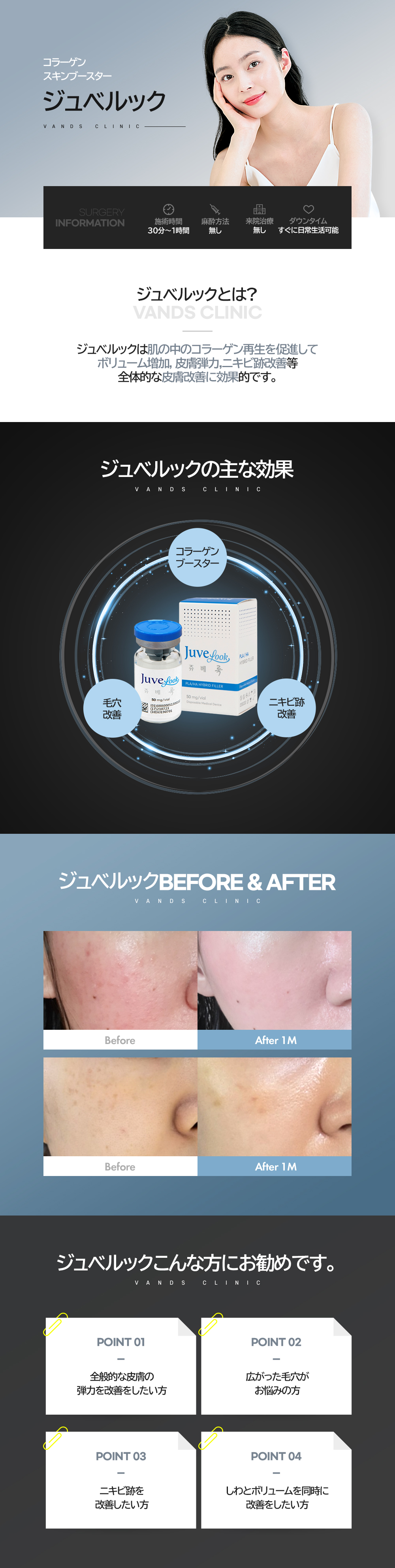 ジュベルックは高分子PLAと人体皮膚組織に存在するヒアルロン酸を結合させた自己組織再生コラーゲンブースターです。 皮膚に注入された後、すぐにボリューム効果が現れる一般的なフィラーとは異なり、自己コラーゲンの生成を促進し、 自然なボリューム感を与えるとともに、肌のハリや小ジワ、肌質の改善にも効果が期待できます。