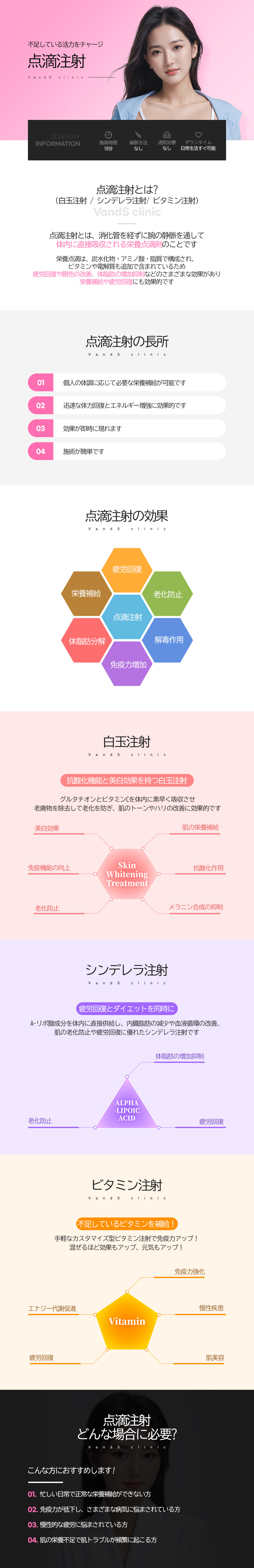 - 点滴形式の施術のため、腕にあざ・腫れ・軽い痛みなどが生じることがありますが、すぐに回復します。